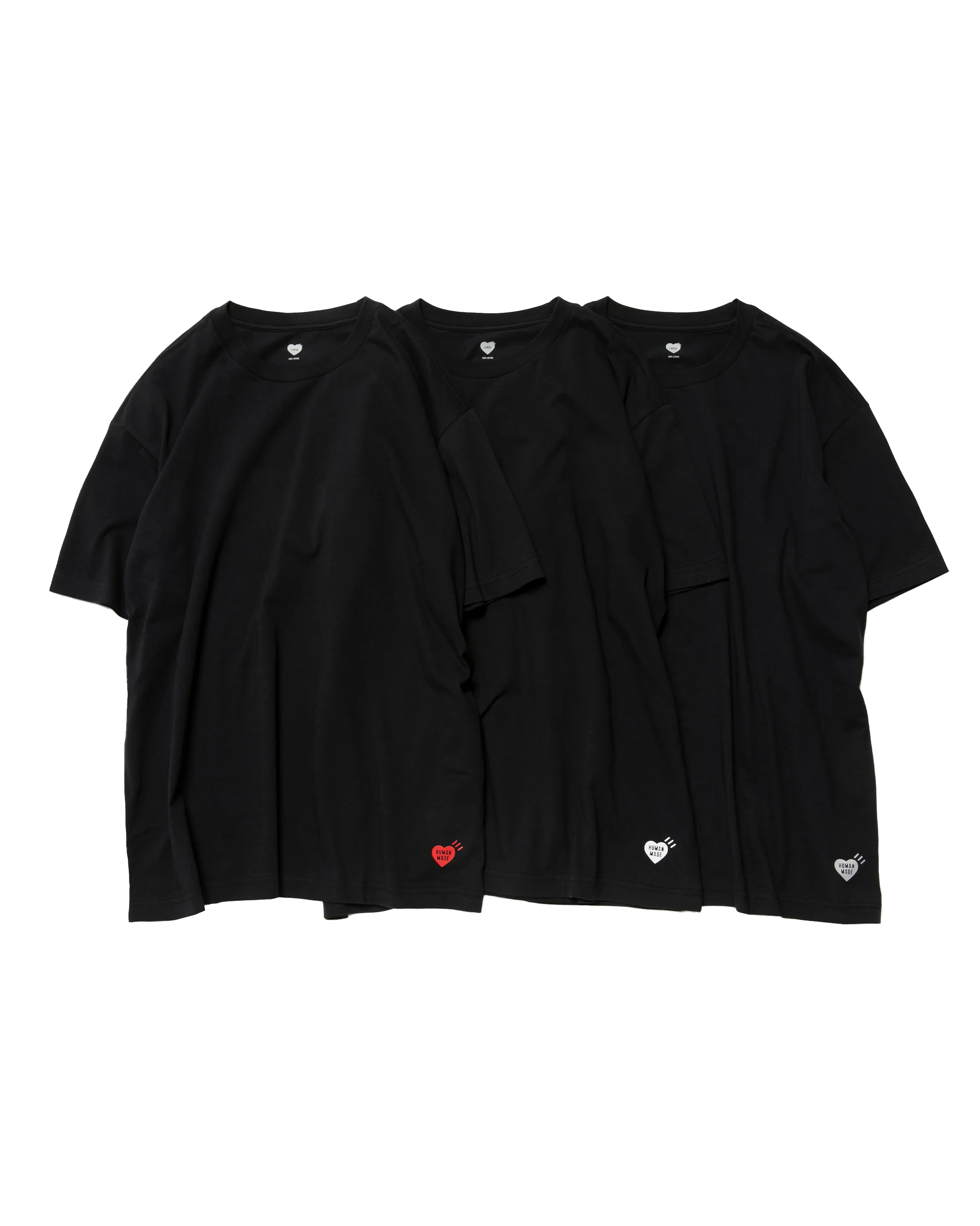 This 3-pack T-shirt set features three shirts. each featuring a unique heart logo in different colors printed on the left hem.