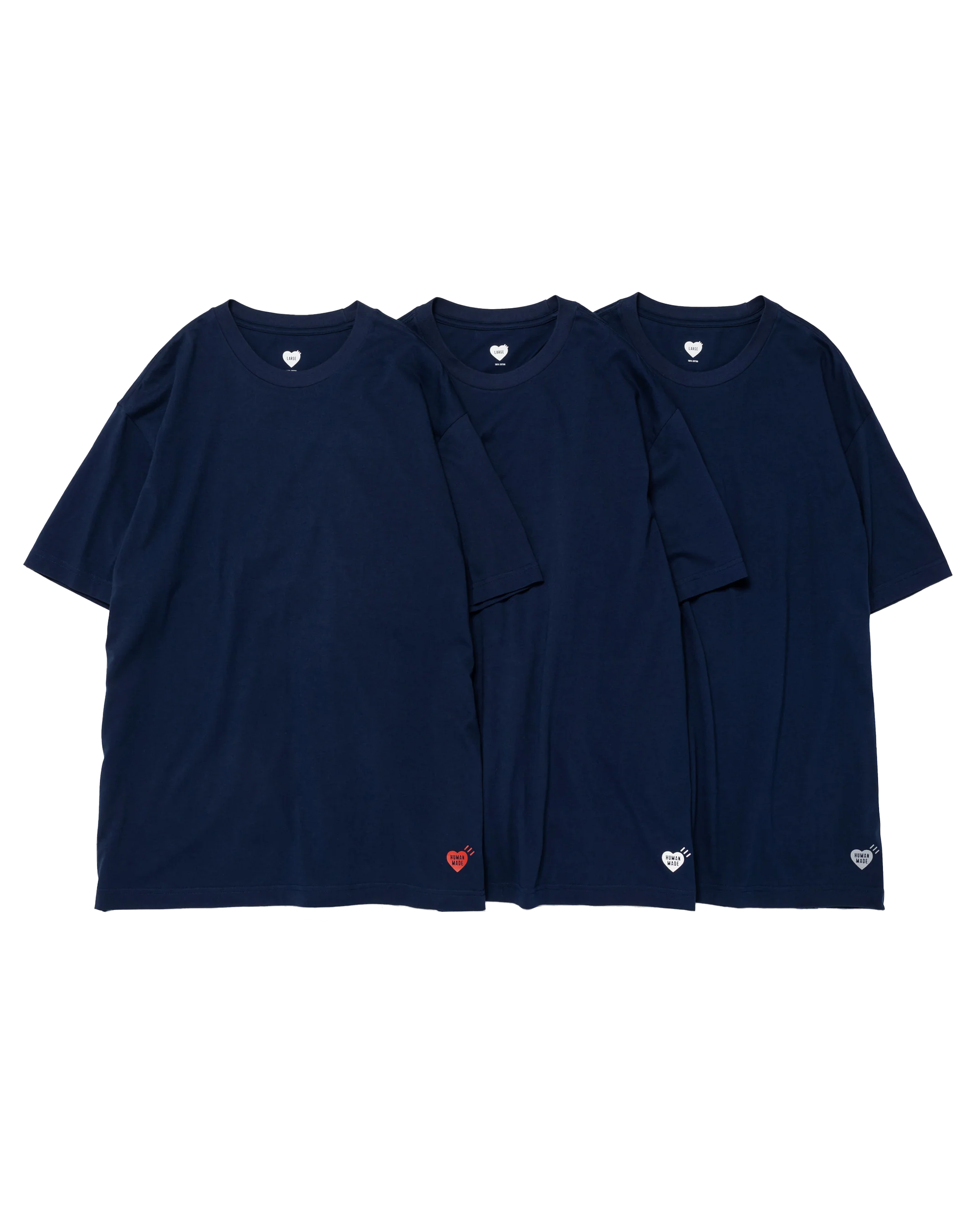 This 3-pack T-shirt set features three shirts. each featuring a unique heart logo in different colors printed on the left hem.