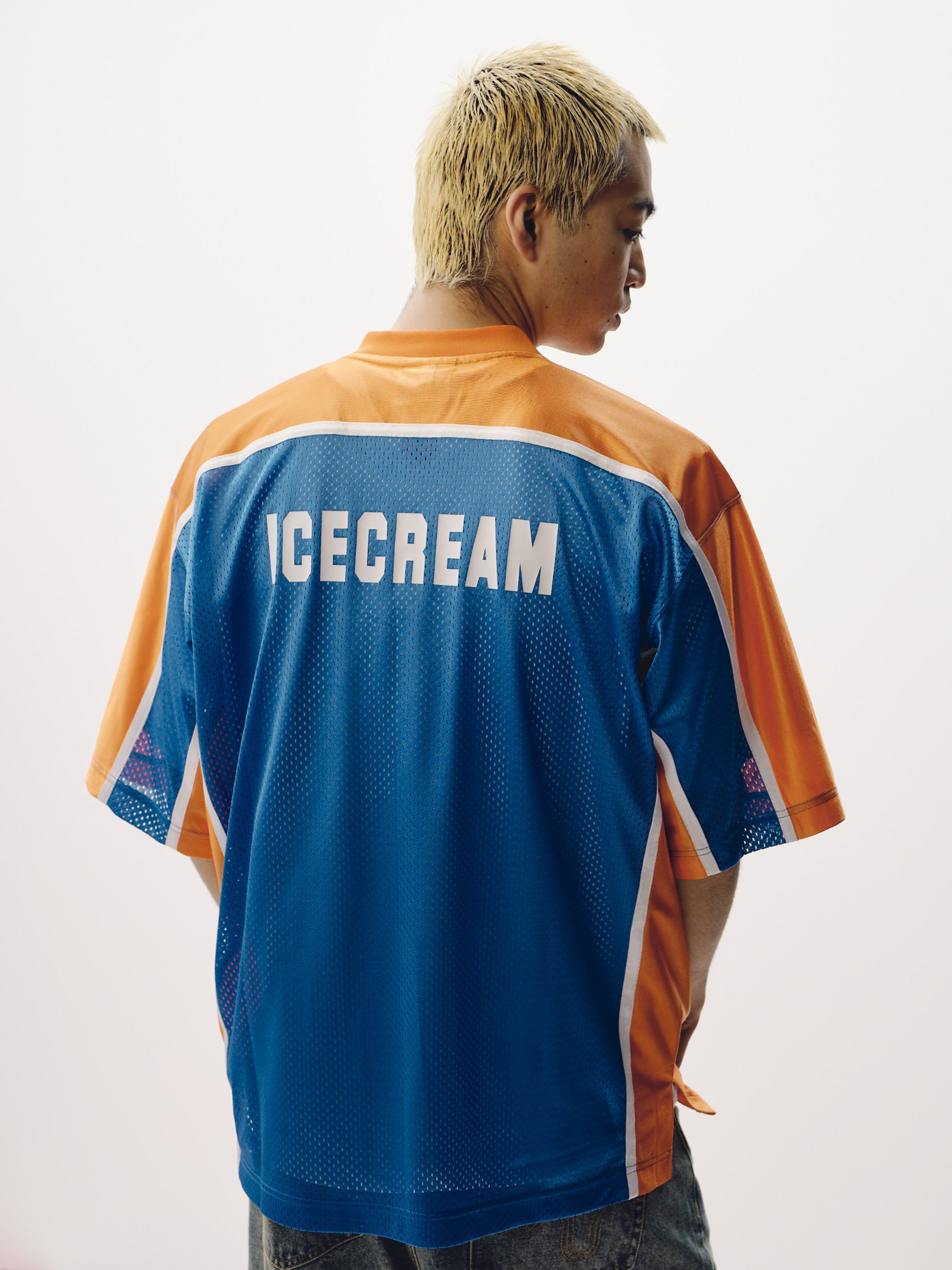 This Bulldog Football Top presents a mesh semi-front and back for extra-breathability; it is decorated with the ICECREAM bulldog appliqué graphic on the front and a screen printed ICECREAM logo at the back. Detailed with a contrasting piping and panels.