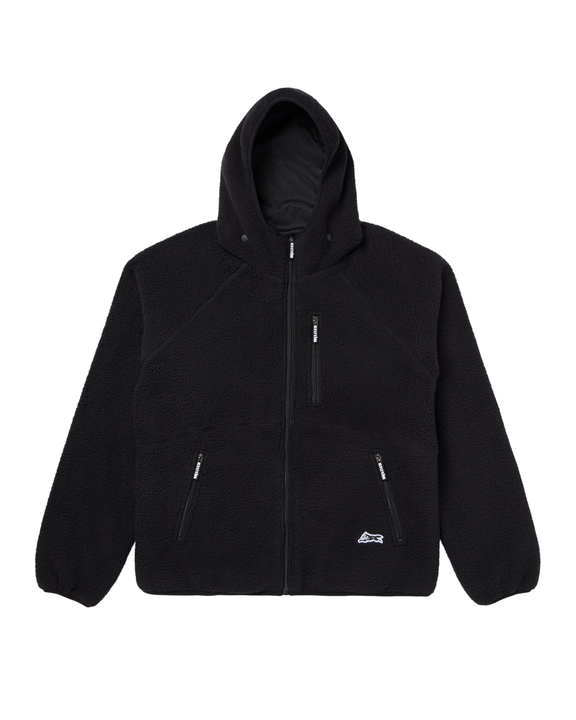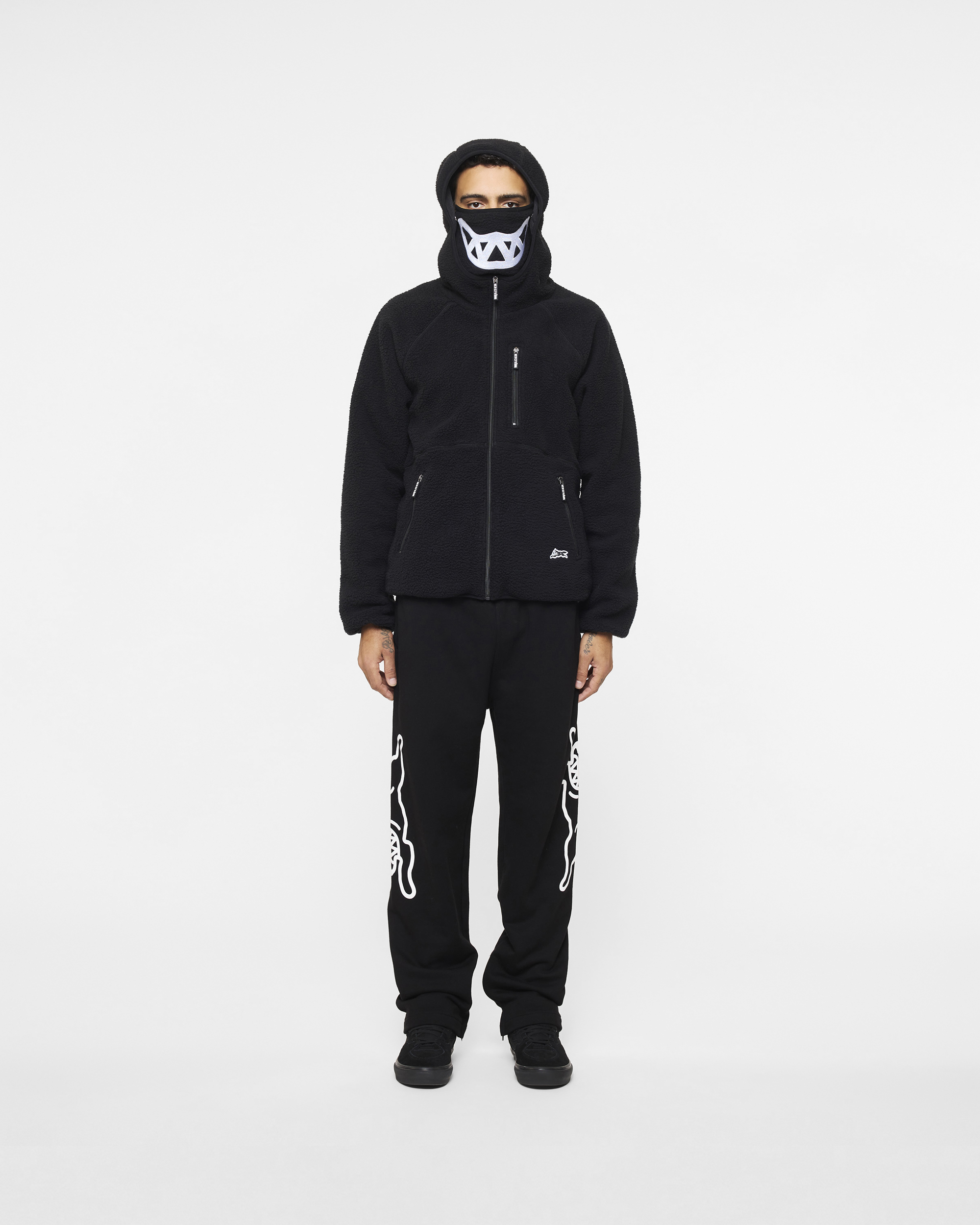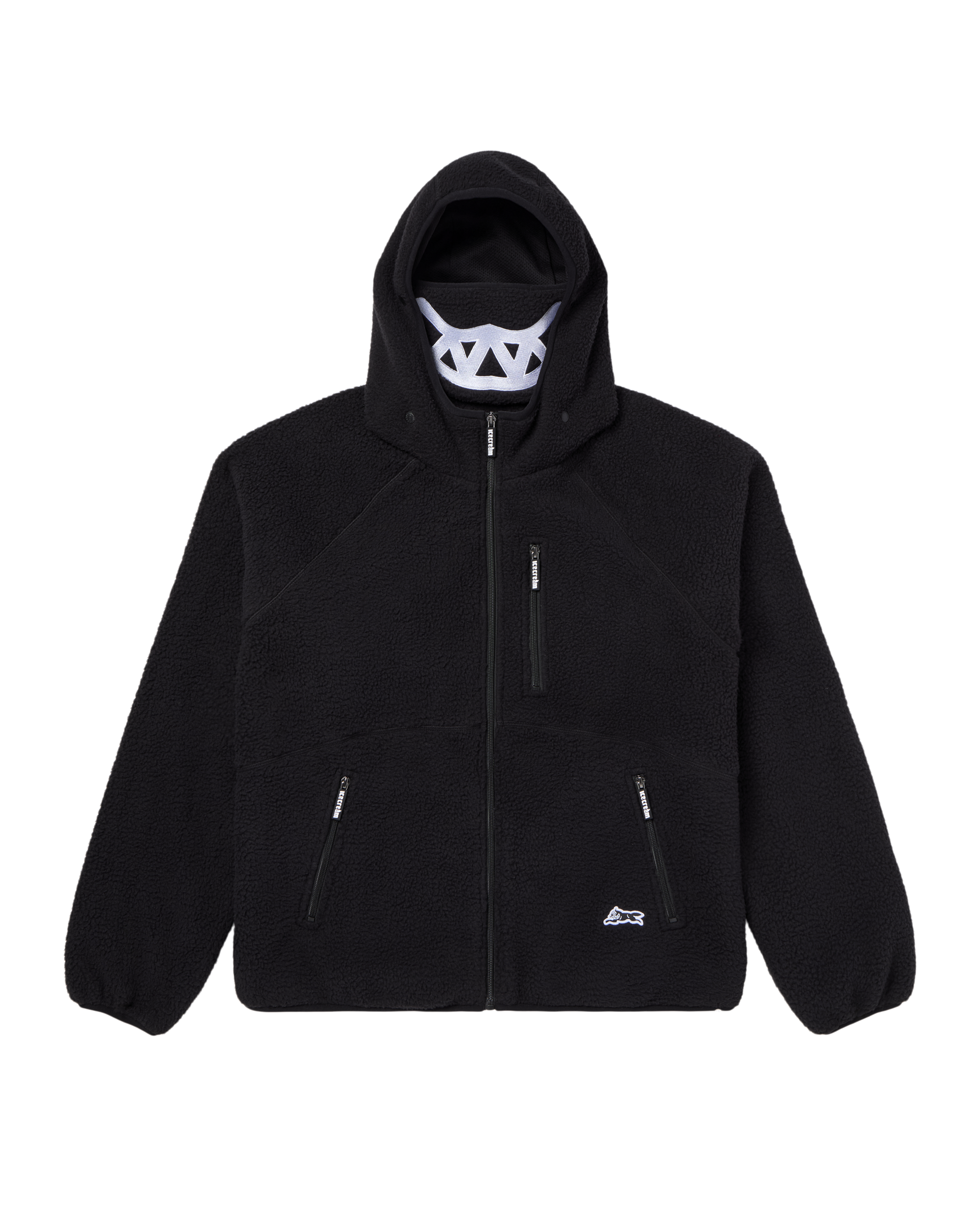 This Hoodie includes a detachable dog grin face mask. a Running Dog woven label. and an inner cinch bottom opening.