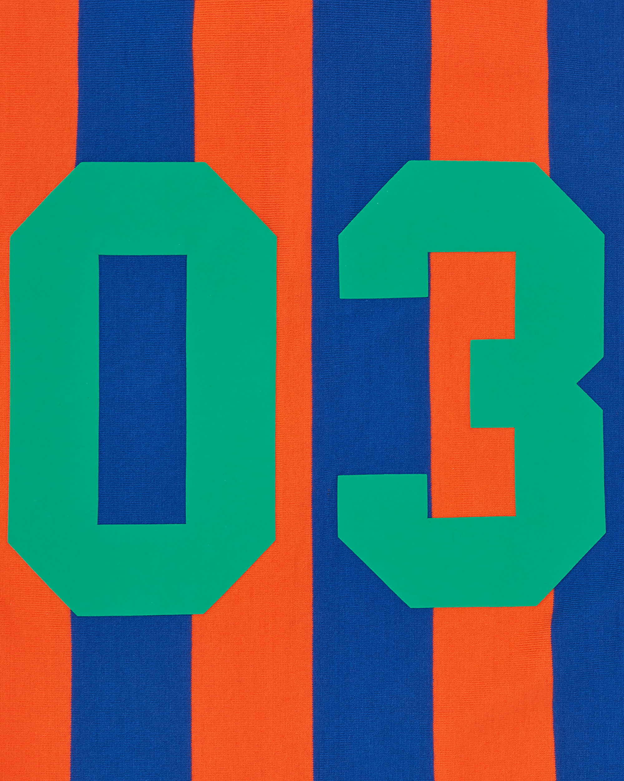 Produced using 100% cotton. the Heavy Striped Rugby Shirt features the embroidered Astro helmet patch at front and a classic shirt-style collar. Puff-printed style kit number ’03’ on the back.