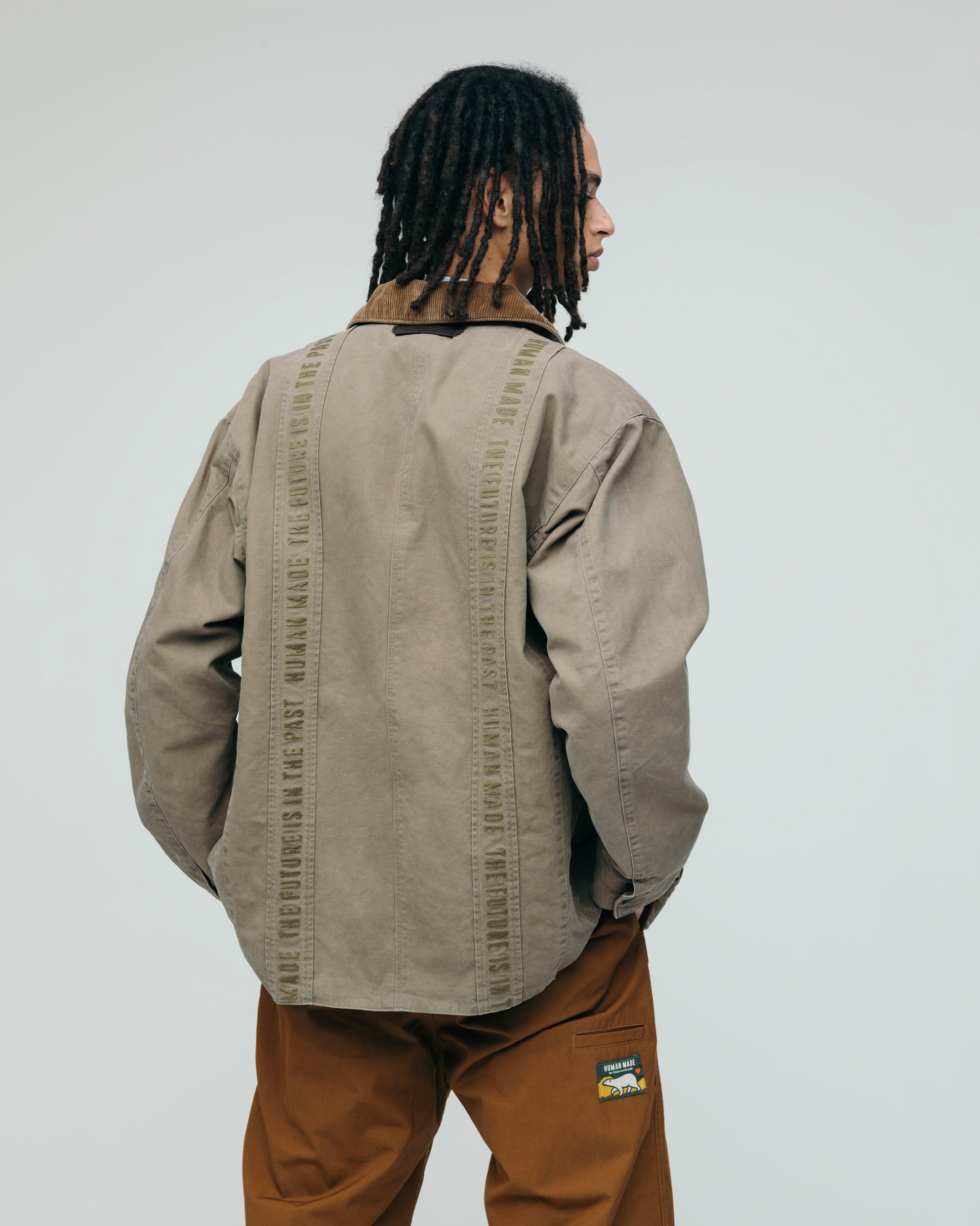 A hunting jacket with a corduroy collar and an embroidered logo along the front and back.