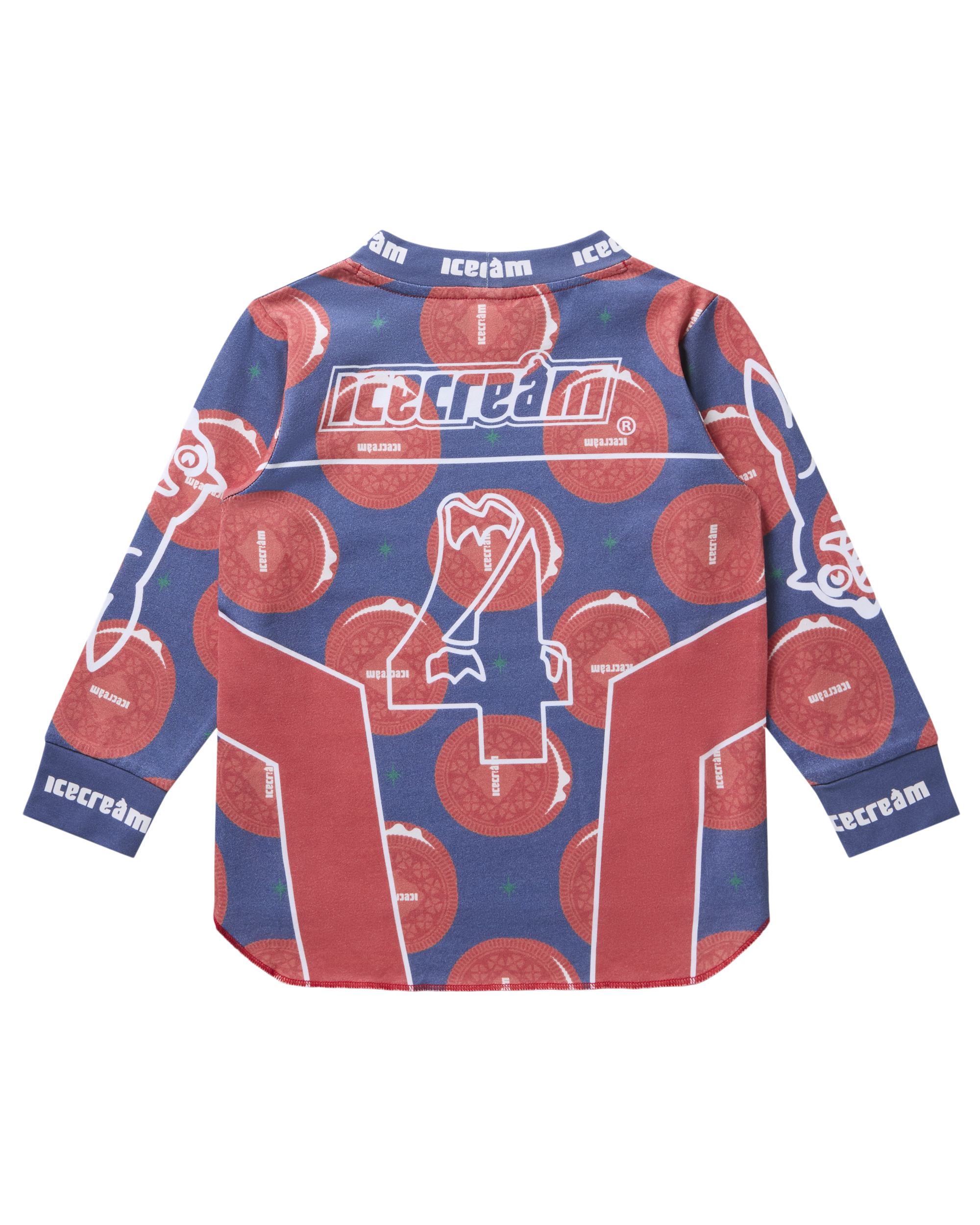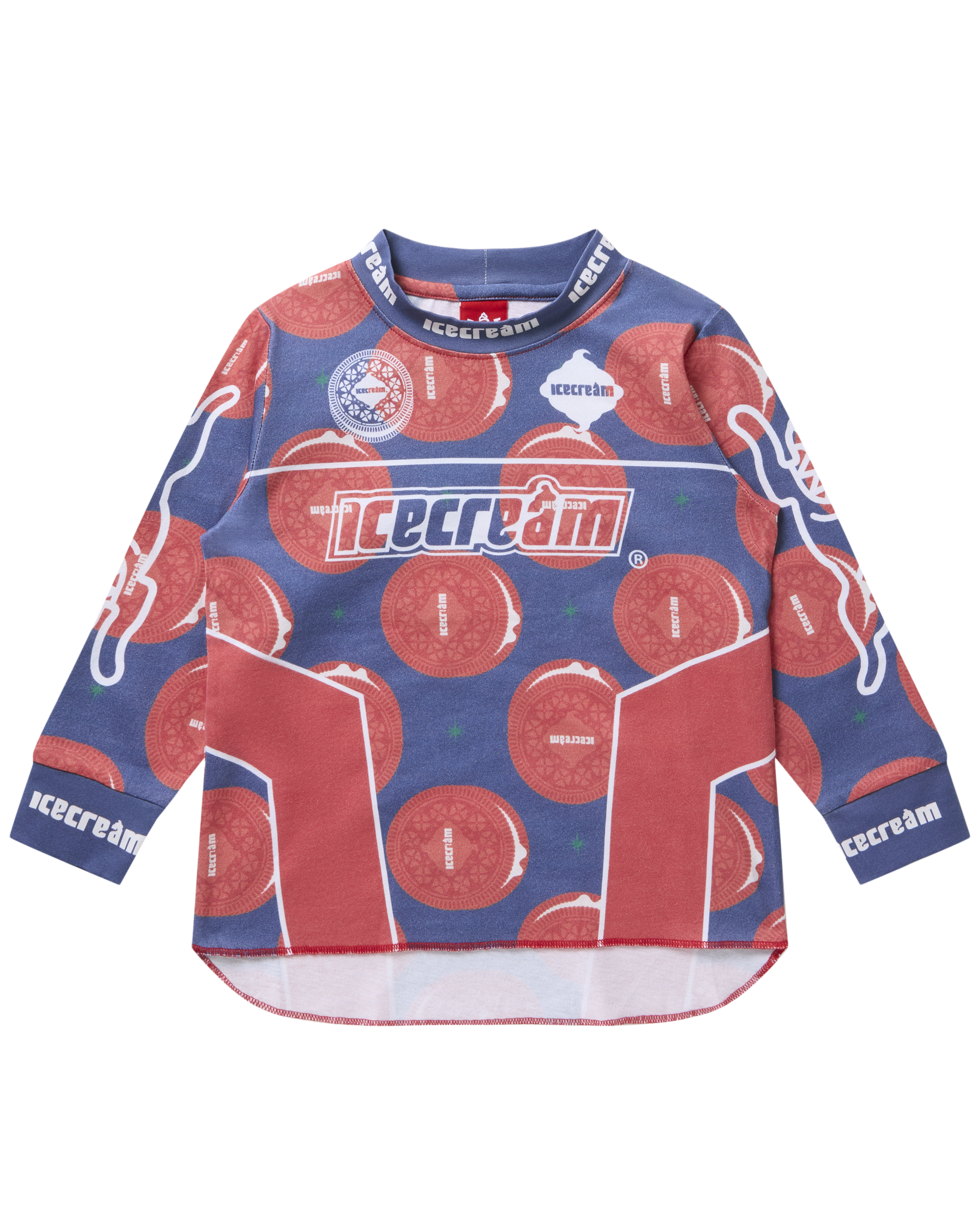 Kids Cookie Long-sleeve Jersey displays a cookie pattern with the ICECREAM logo. plus the logo is also printed on the collar and sleeves.