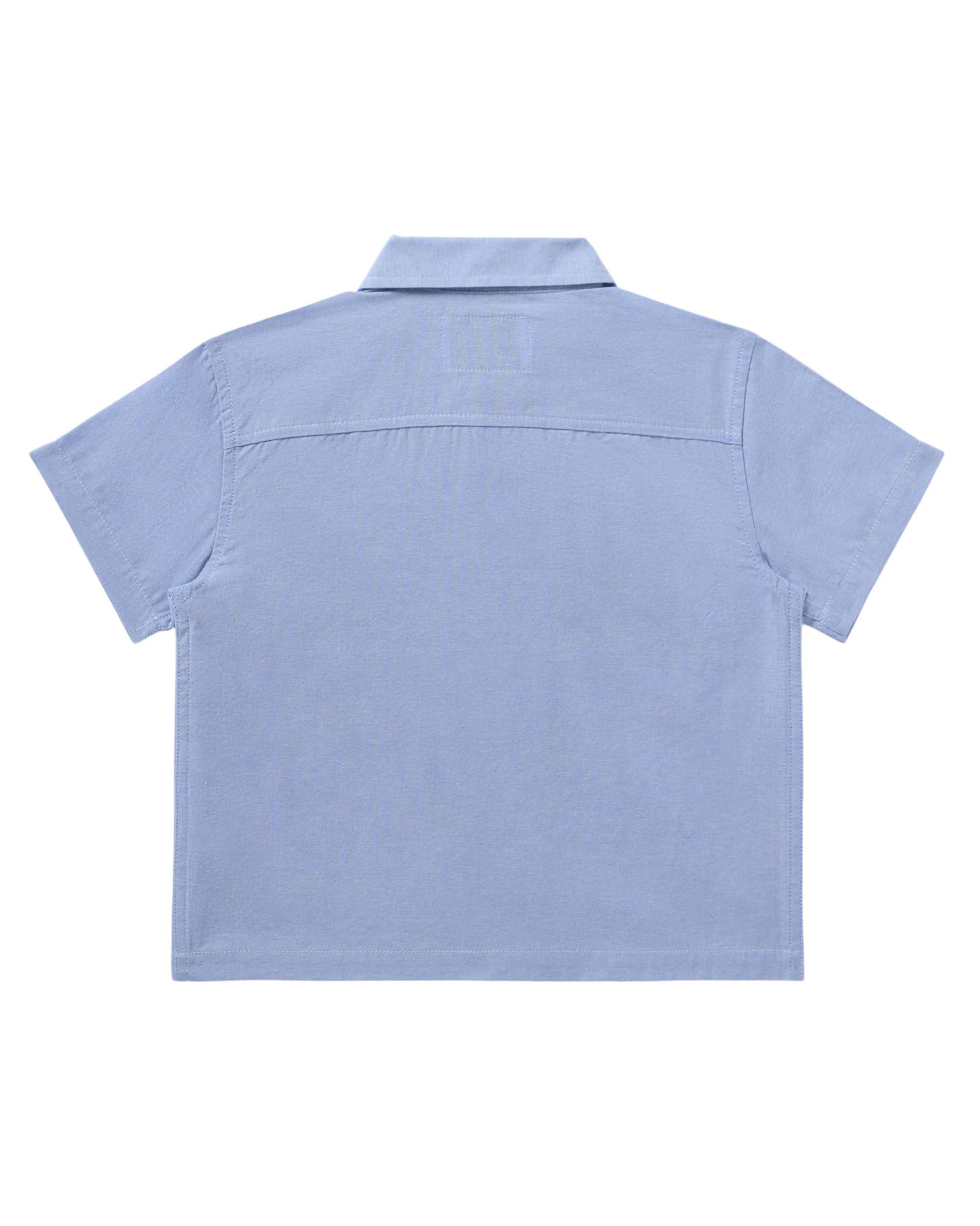 This kids shirt is designed with chest pockets and decorative patches on the front for added detail.