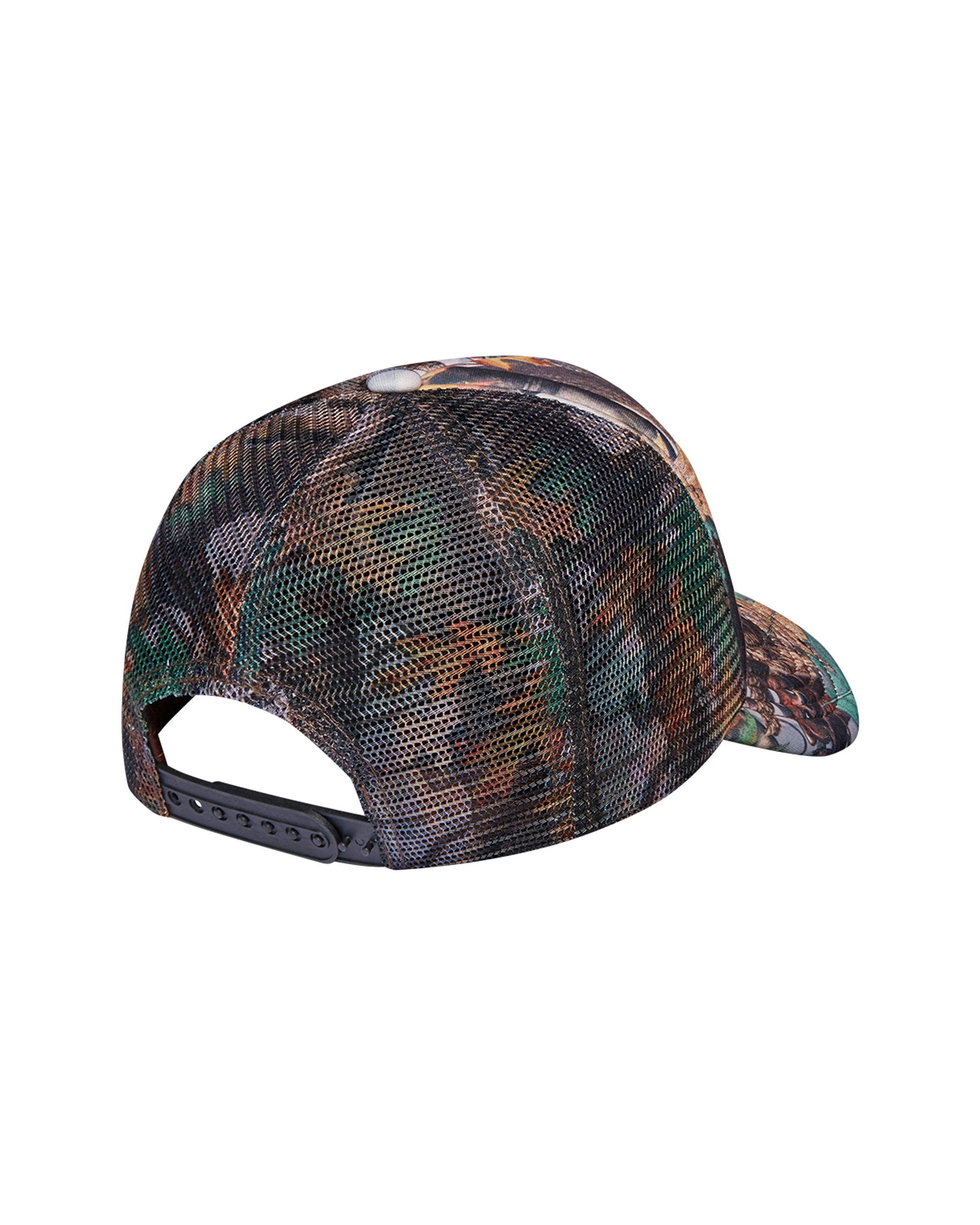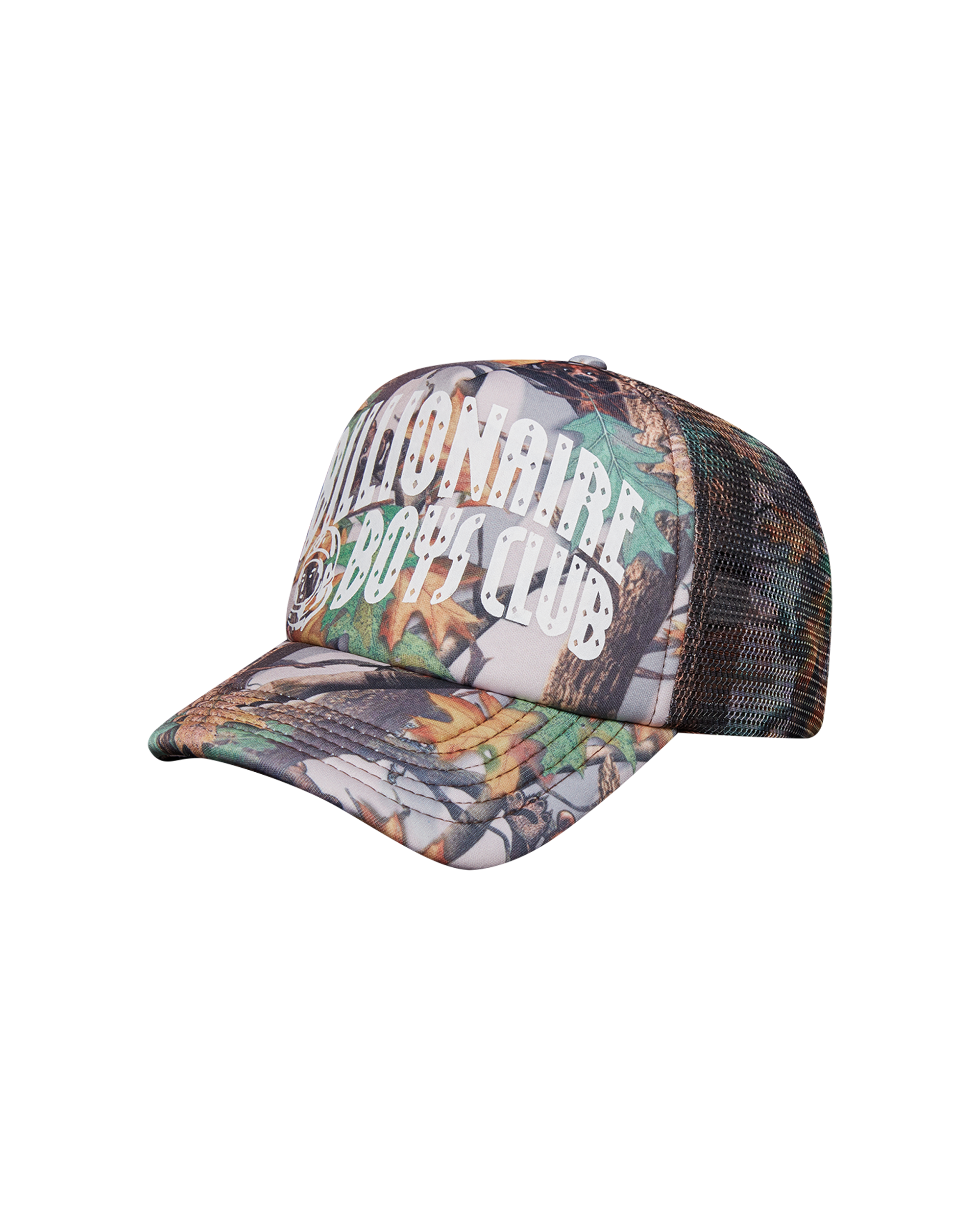 Kids Tree Camo Arch Logo Trucker Cap featuring a full tree camo print and a screen-printed arch logo on the front.