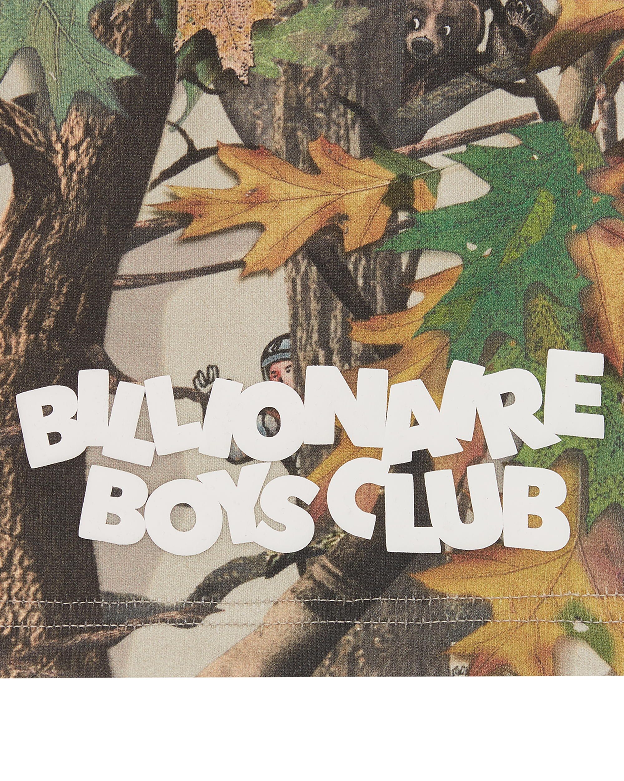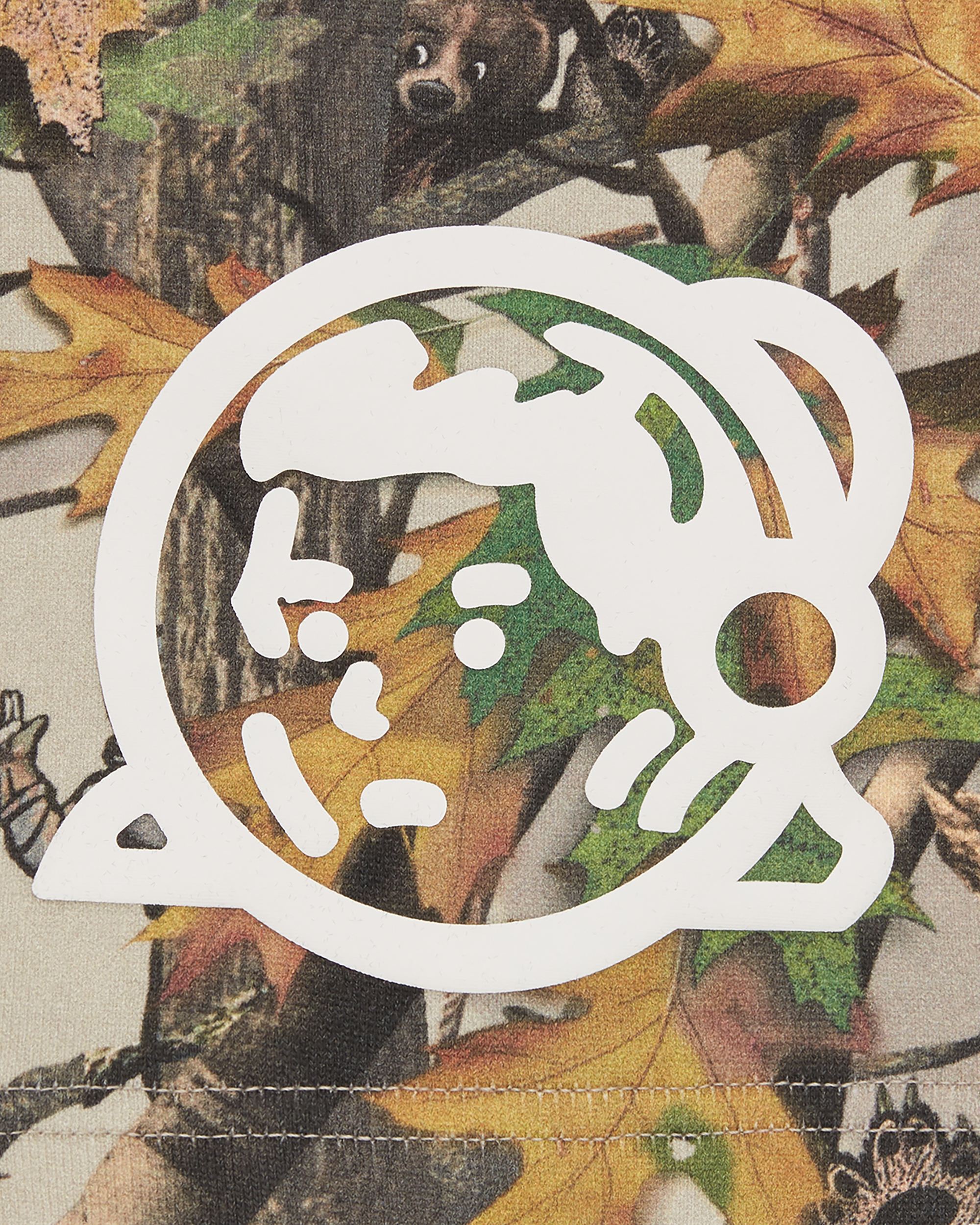 These Tree Camo Shorts have an elastic waistband. a full Tree camo print. a Puff print Helmet head on the front. and the Kids Block logo on the back.