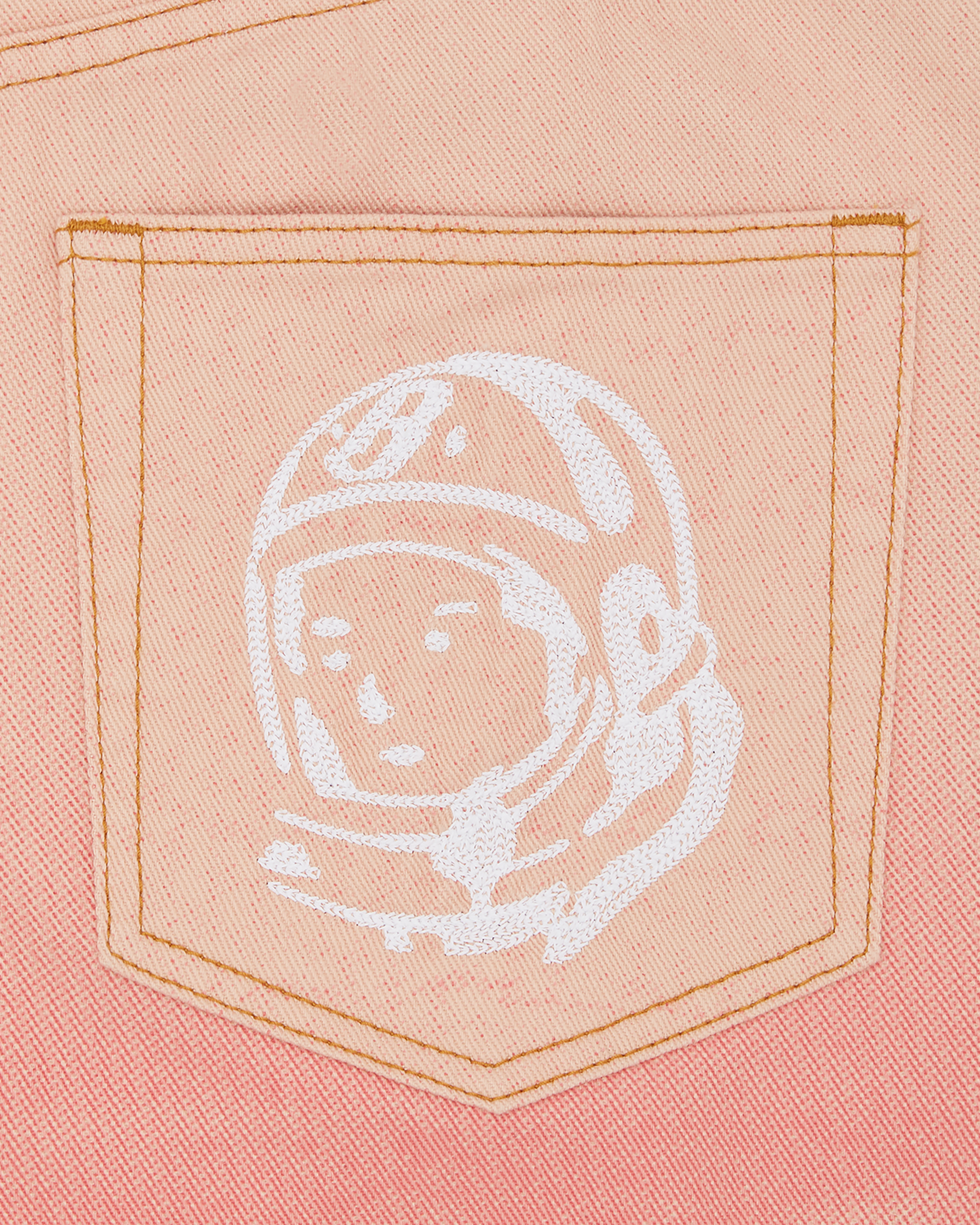 Mountain Print Astro Denim Pants features a pink dye wash mountain graphic. complete with an embroidered Astro helmet on the back pockets and a dollar signet at the coin pocket.