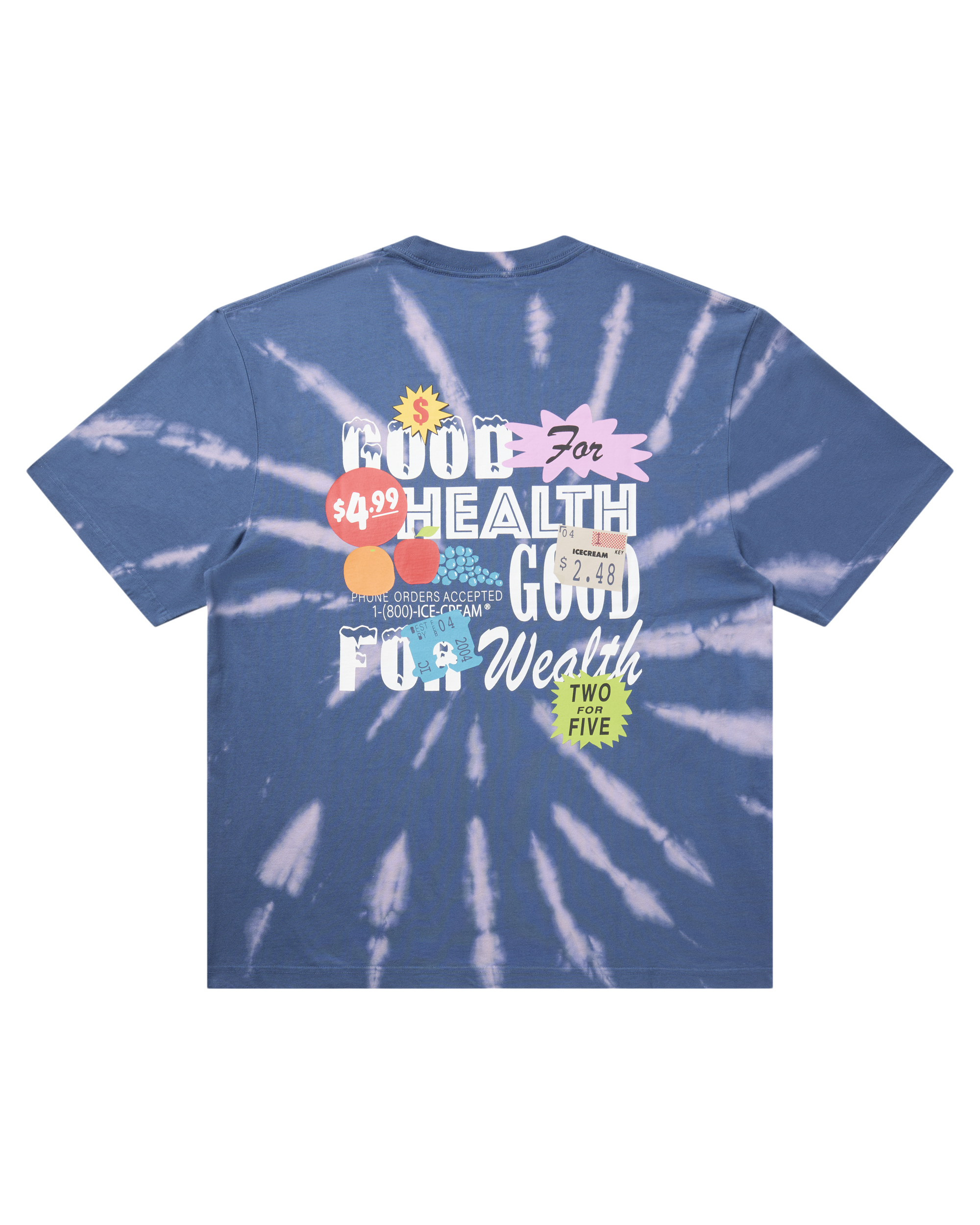 The Price Check Tee features a tie-dye pattern. the ICECREAM Logo on the front left chest. and a back design with the saying Good health. good for wealth.