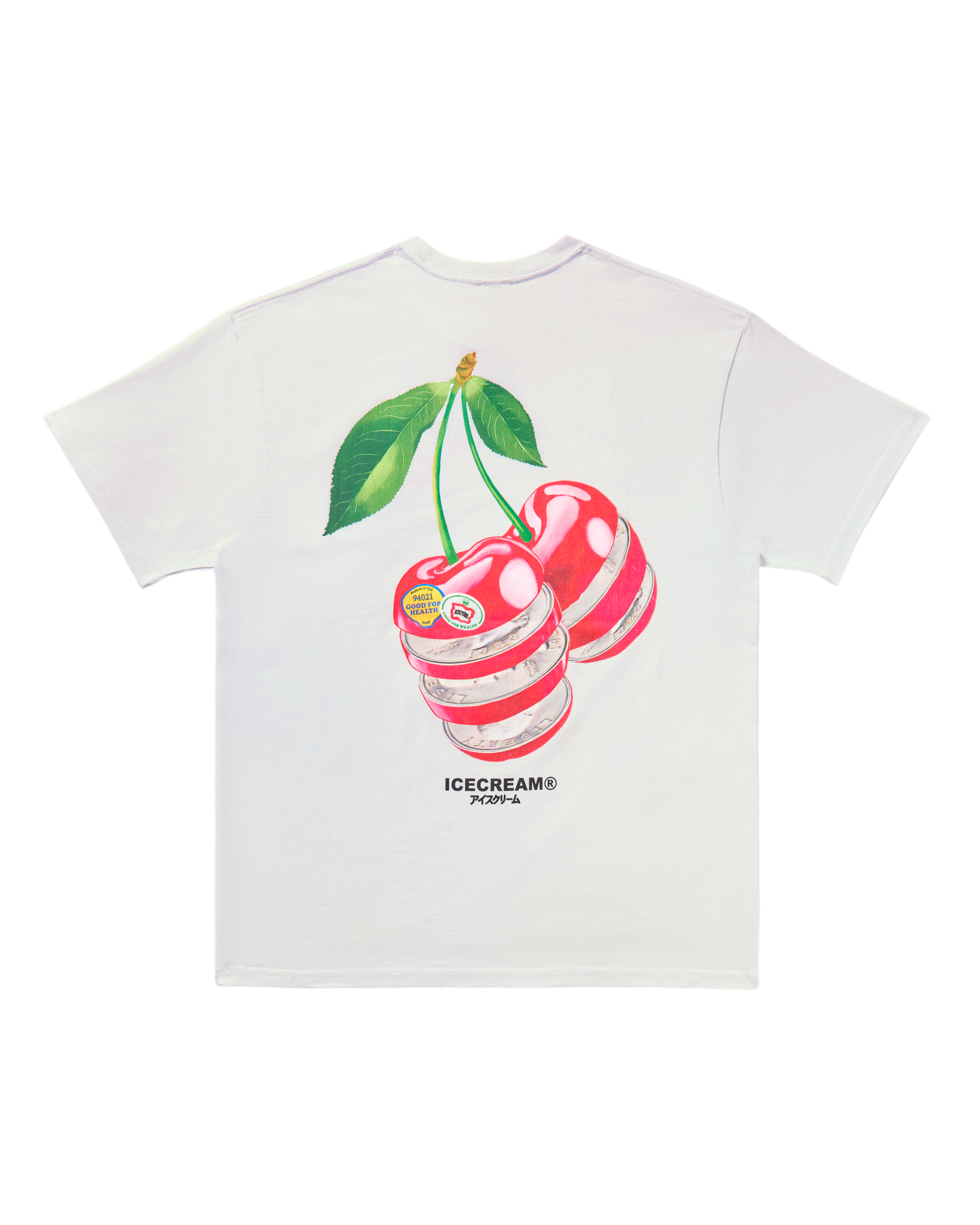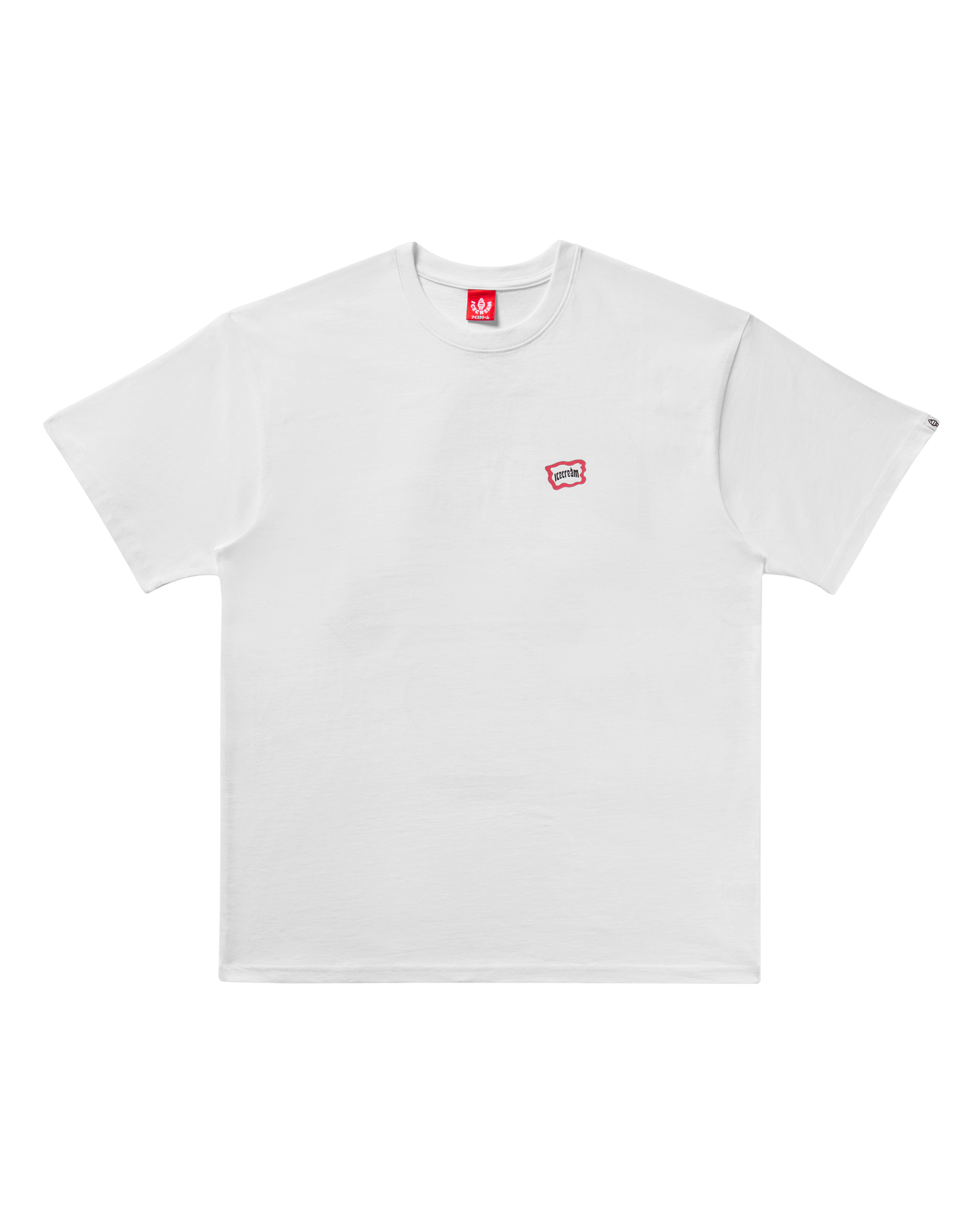 This T-shirt showcases a screen-printed logo on the front left chest and a graphic design on the back.
