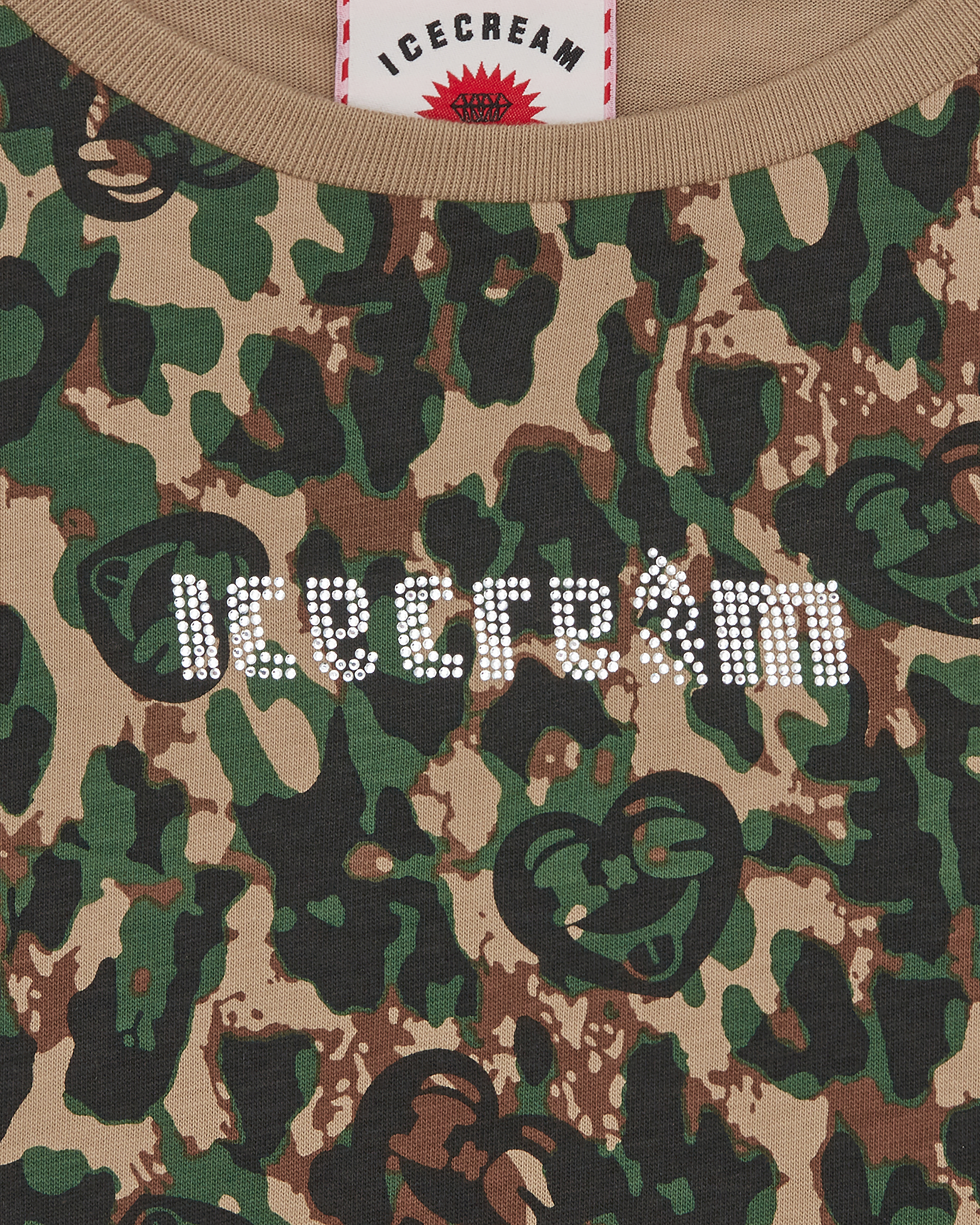 Crystal Soft Serve Baby Tee presenting filled rhinestone ICECREAM logo on the chest and an all-over camo print. Baby tee fit.