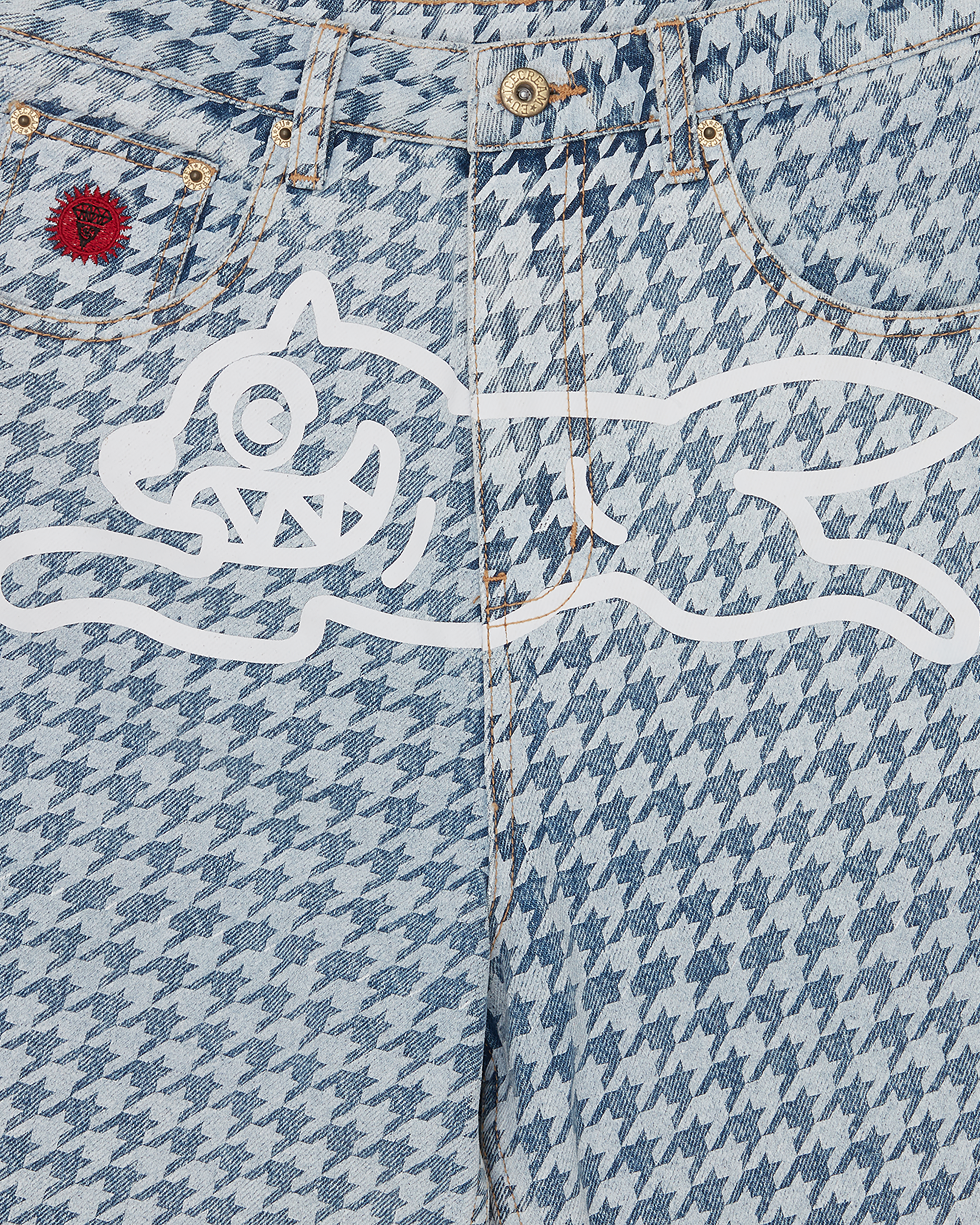 Houndstooth Running Dog Denim Shorts. featuring an all-over houndstooth graphic. the iconic screen-printed running dog graphic on the front. embroidered IC signet. embroidered IC lettering on the back pockets. and a zip-fastened fly. Loose fit.