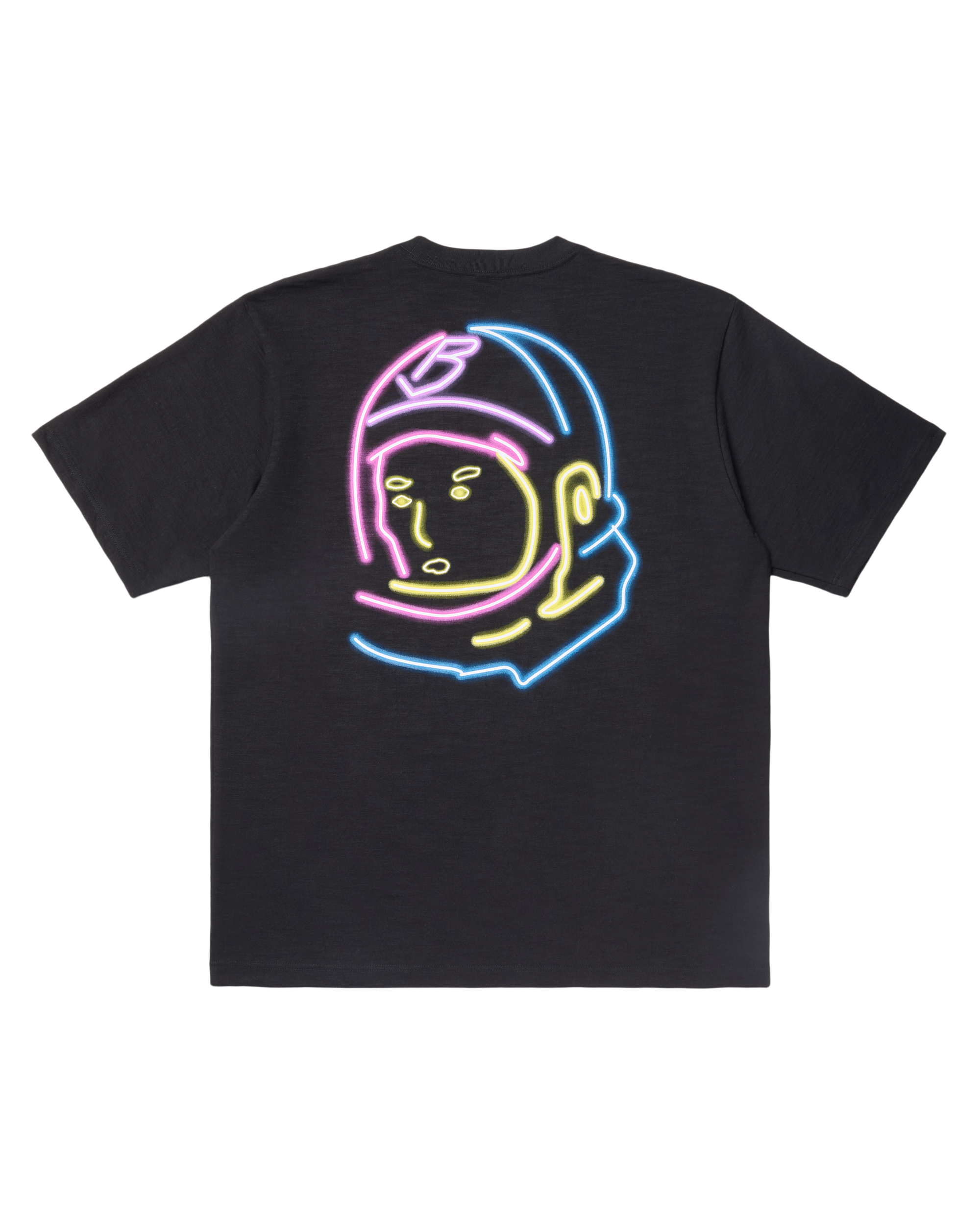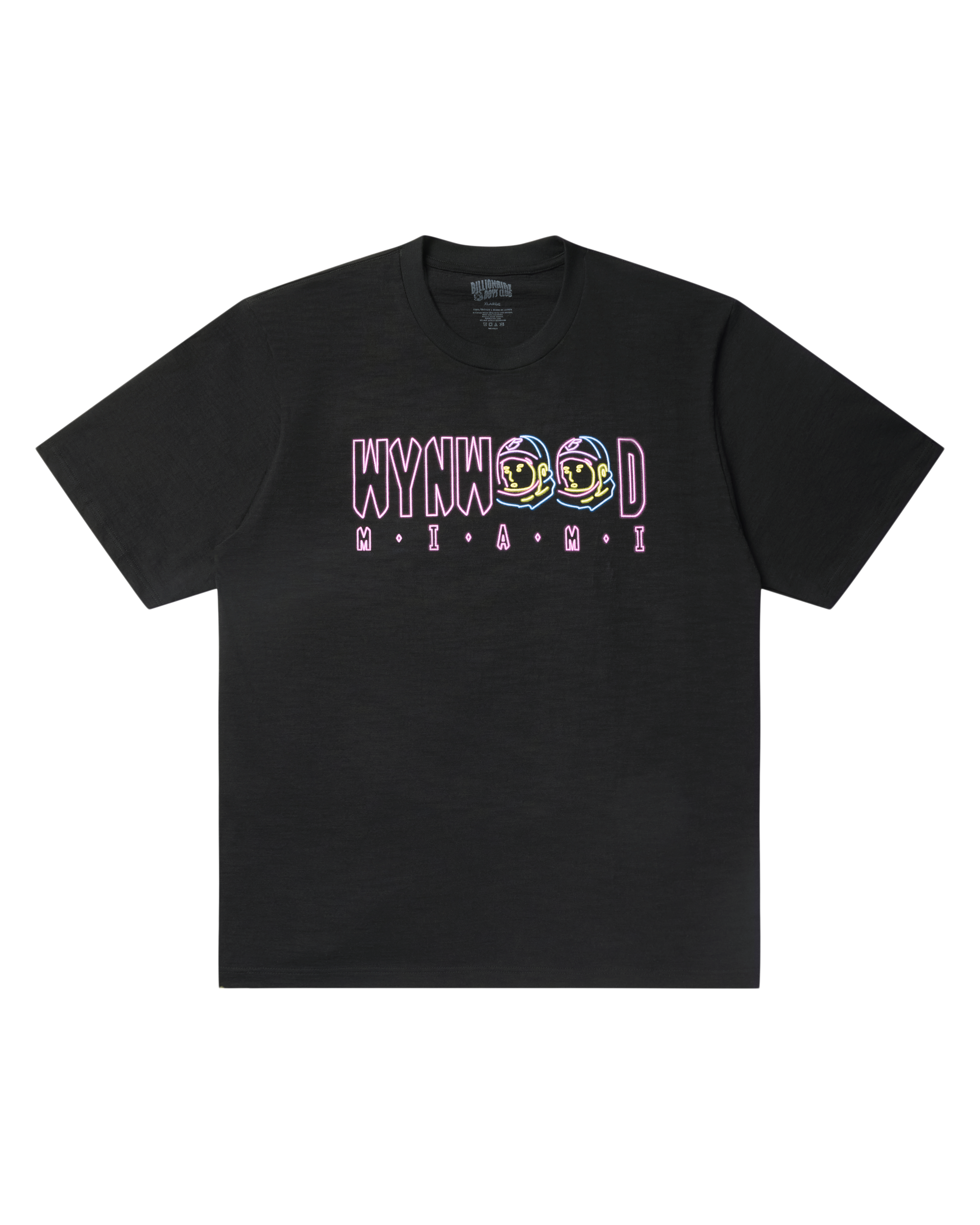 The Wynwood Neon Logo Tee features bold Wynwood Miami lettering in neon pink with two vibrant Helmet head logos on the front and a Neon Helmet Head logo on the back.